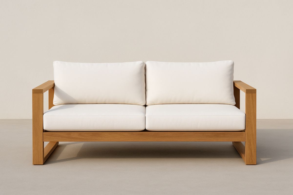 Divano in legno massello con cuscini bianchi